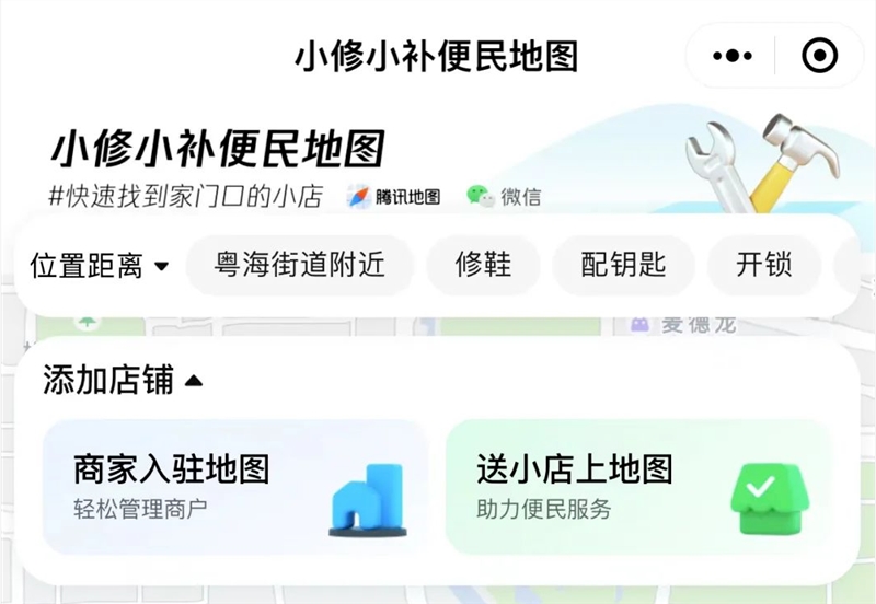微信宣布,只要在微信搜一搜或腾讯地图App搜索关键词“小修小补”,将会进入一张神奇的“便民修补小店地图”,引导快速找到附近的修补点位,查看地理位置、门面照片、营业时间、联系电话等,还可以一键导航。