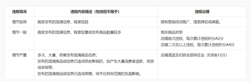 针对违规情况,平台将依据【商家—发布混淆信息】实施细则、【创作者推广侵权/假冒商品】实施细则中的相关规定,对商家采取限制营销活动推广、商品封禁、店铺扣分清退及扣除保证金等处置措施,对创作者采取扣除信用分、帐号商品分享功能停用整改/永久关闭或永久封禁帐号等不同程度的处置措施。